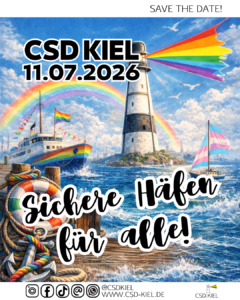 Das Motto des CSD Kiel 2026 steht fest! Am 11.07.2026 gehen wir unter dem Motto „Sichere Häfen für alle!“ auf die Straße.
